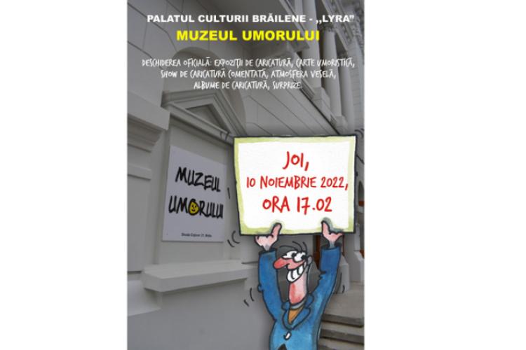 Muzeul Umorului își deschide larg porțile! Joi, 10 noiembrie, de la ora 17.02, caricaturistul Costel Pătrășcan vă invită la deschiderea oficială a muzeului, cu sediul la Palatul Culturii Brăilene LYRA, în Centrul vechi, pe Strada Cojocari nr. 21. La eveniment vizitatorii vor avea parte de expoziții de caricatură, carte umoristică, show de caricatură comentată, atmosferă veselă, albume de caricatură și alte surprize.