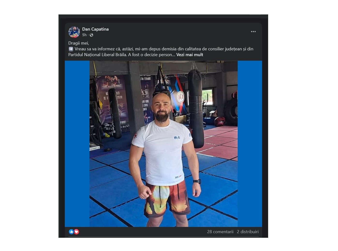 * binecunoscutul antrenor de kickboxing brăilean, Dan Căpățînă a anunțat că a luat decizia de a demisiona din PNL Brăila, dar și din funcția de consilier județean * într-un anunț făcut pe rețelele de socializare, acesta a invocat motive personale în privința gestului său * Căpățînă a punctat că se va concentra pe cariera sa sportivă și s-a arătat deschis pentru colaborări cu autoritățile locale pe viitor * fostul consilier județean se alătură unui lung șir de demisionari ”din motive personale”