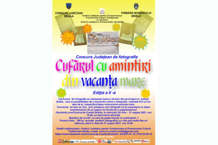 Centrul Județean pentru Conservarea și Promovarea Culturii Tradiționale Brăila (Centrul de Creație), Consiliul Județean și Primăria Municipiului Brăila au dat startul celei de-a II-a Ediții a Concursului județean de fotografie intitulat „Cufărul cu amintiri din vacanța mare”. Potrivit organizatorilor, concursul se adresează tuturor elevilor din municipiul și județul Brăila care au posibilitatea de a trimite online o fotografie realizată într-un loc ales de ei, respectând tema concursului – vacanța mare.
