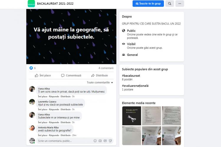 * un absolvent din promoțiile anterioare a reușit să facă fotografii subiectelor în timpul probei de ieri a examenului, pe care le-a postat pe un grup de Facebook – „Bacalaureat 2021-2022”, iar ceilalți membri trimiteau rezolvările * candidatul respectiv a fost identificat ulterior și eliminat din examen pentru fraudă * Ministerul Educației a anunțat că au fost candidați din mai multe județe care au copiat prin această metodă la Bacalaureat
