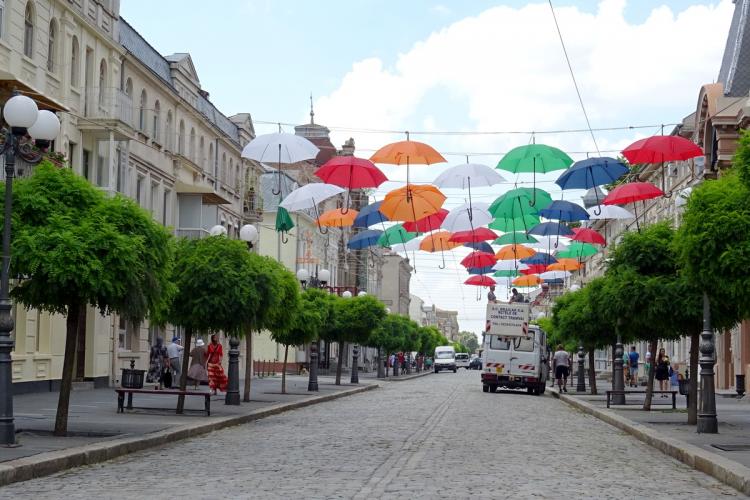 “Curcubeu” de umbrele colorate deasupra străzii Mihai Eminescu