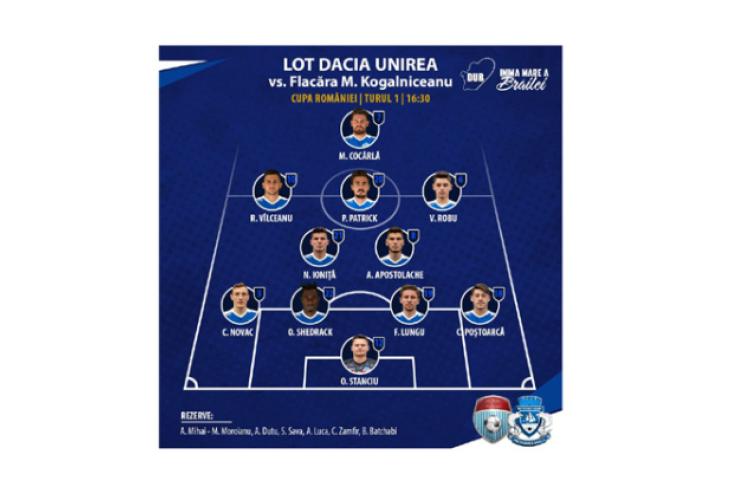 Dacia Unirea s-a calificat în etapa a 2-a naţională a Cupei României după o victorie categorică, 4-0, în deplsasare, la Flacăra Mihail Kogălniceanu, echipă din Liga a IV-a din judeţul Tulcea. Scorul putea fi însă unul cel puţin dublu dacă Patrick Petre, Vîlceanu şi Duţu nu trimeteau mingea în barele porţii adverse. De asemenea, în repriza a doua, Sava şi Duţu au rămas, pe rând, în situaţie de unu la unu cu portarul advers dar nu au reuşit să-l învingă.