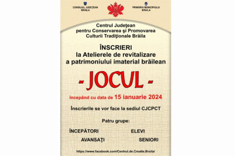 Astfel, Consiliul Județean Brăila – prin Centrul Județean pentru Conservarea și Promovarea Culturii Tradiționale (Centrul de Creație) – și Primăria Municipiului Brăila organizează, pe tot parcursul anului 2024, Atelierele de revitalizare a patrimoniului imaterial – Jocul, evenimente desfășurate sub egida „Identitate strămoșească a satului contemporan – conservare, revitalizare și promovare”. Atelierele vor avea următoarele grupe: avansați, începători, elevi și seniori.