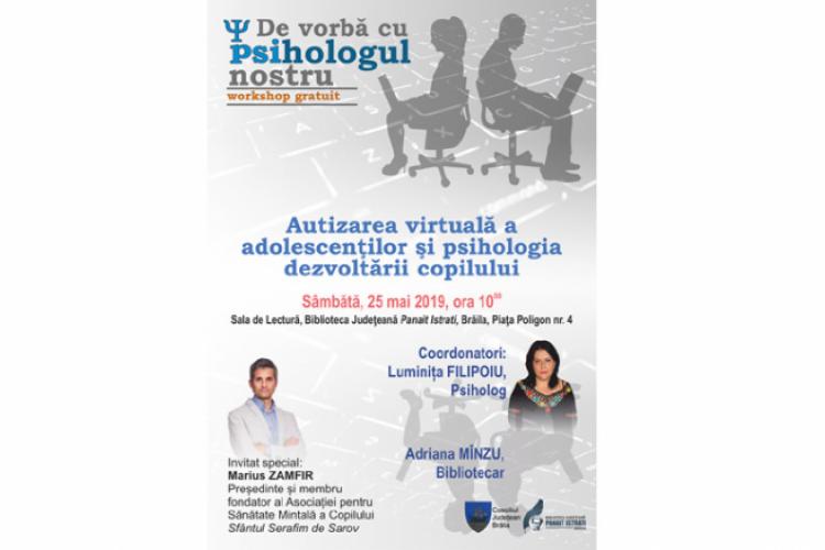 Sâmbătă, 25 mai, ora 10.00, la Biblioteca Judeţeană “Panait Istrati”, Sala de Lectură, va avea loc workshop-ul “Autizarea virtuală a adolescenţilor şi psihologia dezvoltării copilului”, susţinut de Luminiţa Filipoiu, psiholog. La eveniment participă ca invitat special Marius Zamfir, preşedinte şi membru fondator al Asociaţiei pentru Sănătate Mintală a Copilului “Sf. Serafim de Sarov”.