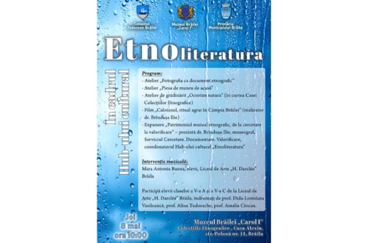 • joi, 8 mai, de la ora 10:00, are loc o nouă întâlnire în cadrul Hub-ului cultural „Etnoliteratura” • programul zilei include trei ateliere, o expunere despre patrimoniul muzeal etnografic și un film: „Caloianul, ritual agrar în Câmpia Brăilei”