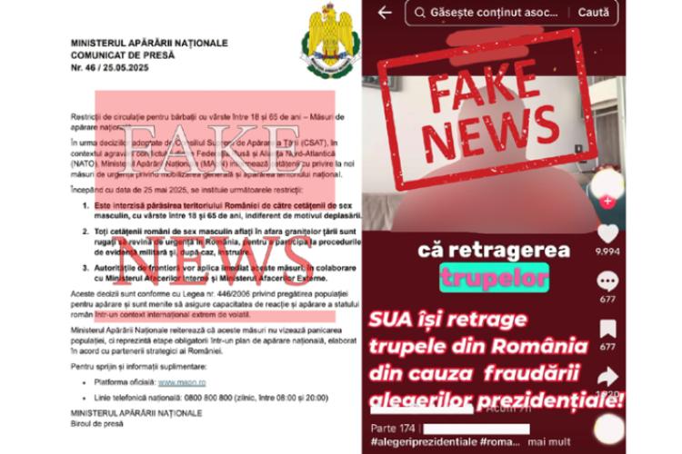 • prima știre falsă folosește un așa-zis „comunicat MApN” și anunță restricționarea circulației cetățenilor de sex masculin cu vârste între 18 și 65 de ani, ca urmare a instituirii stării de mobilizare în România • o a doua acțiune de dezinformare, distribuită pe TikTok, YouTube și Facebook, face referire la așa-zise „decizii” comunicate de autoritățile SUA cu privire la retragerea totală a militarilor americani dislocați în România