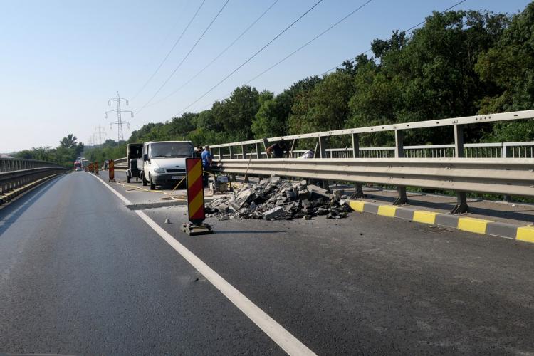 • lucrările de reabilitare a podului ar fi trebuit să fie gata în luna aprilie a anului în curs • abia în luna iunie s-a finalizat partea carosabilă şi s-au ridicat restricţiile de circulaţie • între timp, constructorul şi-a adus aminte că mai trebuie să mai monteze dispozitivele de acoperire a rosturilor • aceste lucrări au termen de finalizare 31 august a.c.