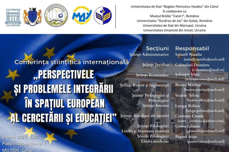 Universitatea de Stat „Bogdan Petriceicu Hasdeu” din Cahul, Republica Moldova, în parteneriat cu instituții similare din România și Ucraina – Muzeul Brăilei „Carol I”, Universitatea „Dunărea de Jos” din Galați, Universitatea de Stat din Mariupol și Universitatea Umanistă din Ismail – organizează cea de-a XI-a ediție a Conferinței științifice internaționale „Perspectivele și problemele integrării în Spațiul European al Cercetării și Educației”.