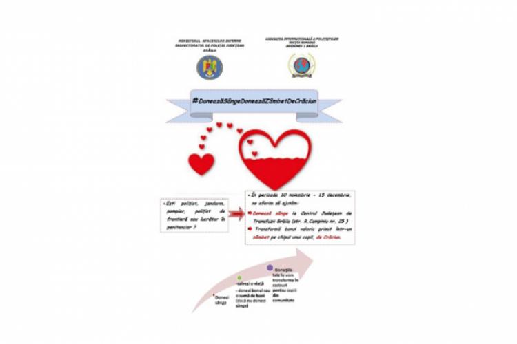 Inspectoratul de Poliţie Judeţean Brăila şi IPA – Regiunea 1 Brăila (Asociaţia Internaţională a Poliţiştilor) organizează o acţiune care va aduce bucurie în sufletele unor copii şi va salva vieţile unor oameni. Este vorba despre o campanie de donare de sânge care a început încă din data de 10 noiembrie şi se derulează până la data de 15 decembrie. Iniţiativa organizării unei astfel de campanii vine de la Poliţiei Municipiului Brăila. Mesajul transmis de organizatori este unul simplu: “Eşti poliţist, jandarm, pompier, poliţist de frontieră sau lucrător în penitenciar? În perioada 10 noiembrie – 15 decembrie ne oferim să ajutăm. Donează sânge în Centrul de Transfuzii Brăila de pe strada R. Campiniu nr. 25. Transformă bonul valoric primit într-un zâmbet pe chipul unui copil, de Crăciun”.