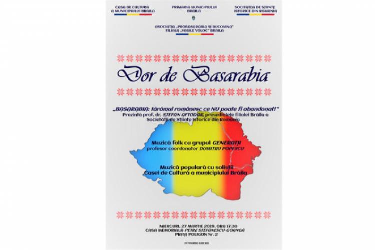 Miercuri, 27 martie 2019, începând cu ora 17.30, la Casa Memorială Petre Ştefănescu-Goangă, din Piaţa Poligon nr. 2 va avea loc manifestarea cultural-artistică “Dor de Basarabia”, prilejuită de împlinirea a 101 de ani de la Unirea Basarabiei cu România. Evenimentul este organizat de Casa de Cultură a Municipiului Brăila, în colaborare cu Asociaţia ProBasarabia şi Bucovina – filiala Vasile Voloc, Brăila şi Societatea de Ştiinţe Istorice din România.