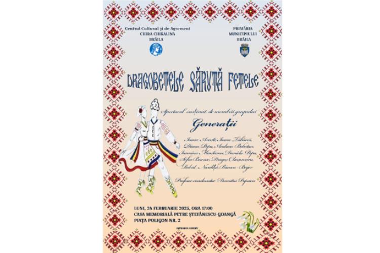• evenimentul, care va avea loc luni, 24 februarie, începând cu ora 17:00, este organizat de Centrul Cultural și de Agrement „Chira Chiralina” Brăila • vor evolua membrii Grupului „Generații”, coordonați de prof. Dumitru Popescu