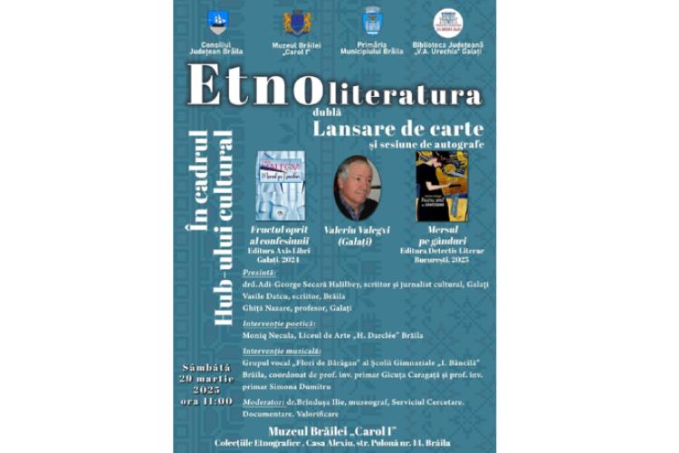 Muzeul Brăilei „Carol I” – Colecțiile Etnografice, în parteneriat cu Biblioteca Județeană „V. A. Urechia” Galați, organizează sâmbătă, 29 martie, începând cu ora 11:00, o dublă lansare de carte și o sesiune de autografe în cadrul Hub-ului cultural „Etnoliteratura”, la Casa Alexiu, din Strada Polonă nr. 14. Publicul brăilean este invitat la lansarea volumelor „Fructul oprit al confesiunii”, apărut la Editura Axis Libri Galați, în anul 2024, și „Mersul pe gânduri”, apărut la Editura Detectiv Literar București, în 2025, autor Valeriu Valegvi.
