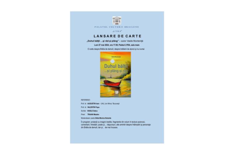 Eveniment editorial și, totodată, filantropic la Brăila. În ziua de luni, 27 mai, ora 17.00, Sala mare a Palatului Culturii Brăilene Lyra, din Centrul Istoric al Municipiului, va găzdui lansarea celui de-al patrulea volum de proză al ing. Vasile Munteniță, „Duhul Bălții… și râd și plâng”, „o carte despre Brăila de demult, despre brăilenii de atunci și numai”. Banii strânși în urma vânzării volumului vor fi donați pentru Bogdi, băiețelul bolnav de cancer.