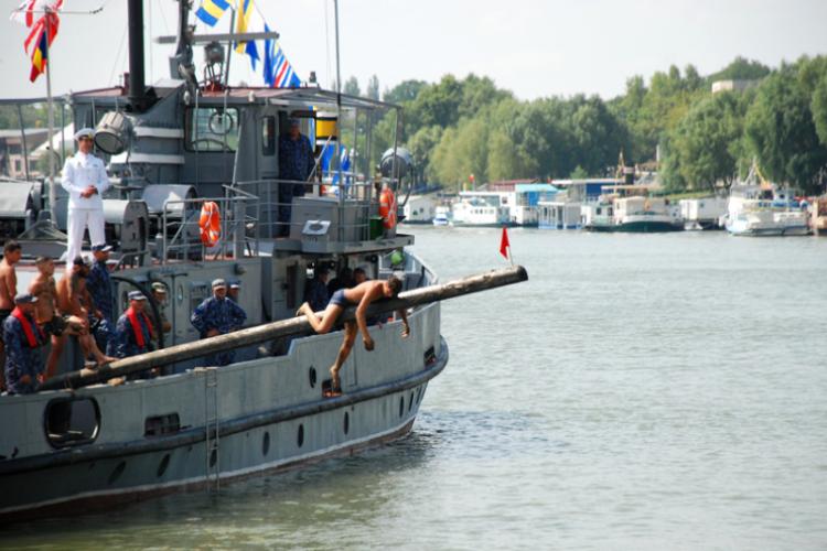 A urmat o paradă a navelor militare și a câtorva nave civile, iar apoi a intrat în scenă zeul Neptul, jucat și în acest an de neobositul actor Florin Chirpac care, însoțit de atrăgătoarele sale nereide, a asistat îngăduitor la botezul de apă al unui tânăr „ghiborț” din rândul marinarilor militari – ras, tuns, îmbăiat, cu tot tacâmul -, apoi a dat startul jocurilor marinărești deschise, ca de fiecare dată, de întrecerea bărcilor. Evident, cea mai așteptată și cea mai savurată probă a fost ”porcul la școndru” care presupune mersul în picioare pe o bârnă înclinată și bine unsă cu vaselină, la capătul căreia se află un steag roșu. Cel care ajunge să pună mâna pe steag primește din partea marinarilor un porc. Cel puțin, asta e tradiția. În practică, însă, premiul din acest an nu a fost un purcel viu ca altădată, ci o pușculiță în formă de purcel, în care se afla contravaloarea de piață a unui exemplar de 7-8 kilograme. Doritori să pună mâna pe porc au fost destui, însă anul acesta niciunul n-a reușit efectiv să ajungă la steagul de la capătul școndrului. Ori pentru că a fost pusă o bârnă nouă, ori pentru că era prea înclinată, ori pentru că s-o fi folosit prea multă vaselină, cert este că înotătorilor care și-au încercat norocul le-a fost imposibil să meargă pe ea, toți căzând în apă după primii pași, care mai de care mai haios, spre deplinul amuzament al publicului. În alți ani, unii mai șmecheri se prindeau cu mâinile și picioarele de bârnă și, deși acest truc este împotriva regulamentului, se târau așa până la steguleț, iar organizatorii îi acceptau drept câștigători. Anul acesta au fost vreo doi-trei competitori care au încercat acest truc, însă nici așa nu au putut să înainteze prea mult. A fost aplaudată, totuși, la scenă deschisă, îndârjirea cu care unul dintre concurenți s-a târât cât a putut pe vaselina alunecoasă, înaintând vreo doi metri până, când, epuizat, a renunțat și s-a aruncat în apă. Totuși, pentru că nimeni altul nu a ajuns la fel de departe ca el, i-a fost acordat premiul. A fost primul an în care steagul roșu a rămas la capătul bârnei, iar câștigătorul a fost stabilit strict pe criteriul perseverenței. Se numește Daniel Ciornei, are 19 ani, și e prima dată când participă la acest concurs. La festivitatea de premiere, a fost felicitat de primarul Marian Dragomir, iar pușculița cu premiul i-a fost înmânată de comandantul Flotilei Fluviale, comandorul Marcel Neculae.