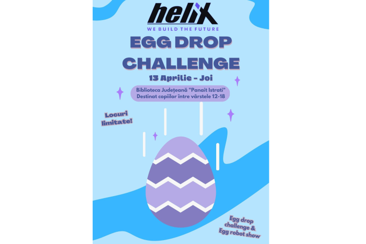 Astăzi, 13 aprilie, de la ora 12.00, Helix Robotics Team și Biblioteca Județeană “Panait Istrati” Brăila are loc un eveniment dedicat adolescenților pasionați de crafting și mecanică: Egg Drop Challenge.