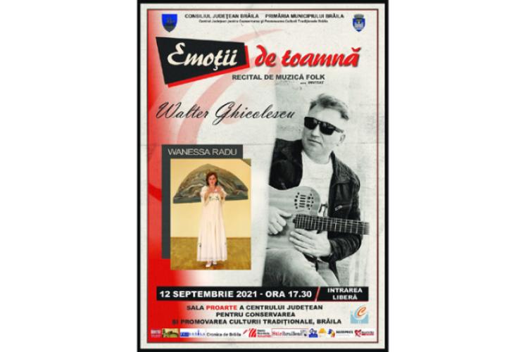 Astfel, Consiliul Județean Brăila, cu sprijinul Primăriei Municipiului și Centrul Județean pentru Conservarea și Promovarea Culturii Tradiționale Brăila (CJCPCT – Centrul de Creație) organizează în ziua de duminică, 12 septembrie, ora 17.30, în Sala ProArte a Centrului Județean pentru Conservarea și Promovarea Culturii Tradiționale din Piața Traian nr. 2, recitalul de muzică folk intitulat „Emoții de toamnă”. Evenimentul va fi transmis live pe pagina de Facebook a organizatorului – Centrul.de.Creatie.Braila.