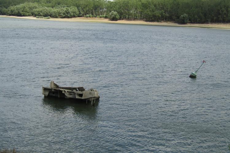 * în zona kilometrului fluvial 172, din apele scăzute ale fluviului a ieşit la iveală o dragă scufundată în urmă cu mulţi ani * epava ar trebui îndepărtată, deoarece după ce nivelul apei va reveni la normal va reprezenta o adevărată capcană pentru navigatorii care nu ştiu de existenţa ei