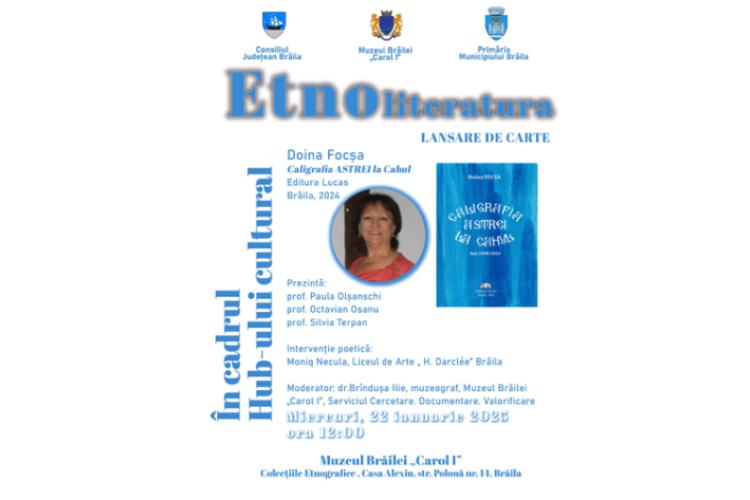 Muzeul Brăilei „Carol ” – Colecțiile Etnografice, în colaborare cu Consiliul Județean Brăila și Primăria Municipiului Brăila, organizează miercuri, 22 ianuarie, începând cu ora 12:00, o nouă întâlnire în cadrul Hub-ului cultural „Etnoliteratura” (pe anul 2025), la Casa Alexiu, monument istoric din Strada Polonă nr. 14. Cu acest prilej, publicul brăilean este invitat la lansarea cărții „Caligrafia ASTREI la Cahul”, autor Doina Focșa. Volumul a fost publicat la Brăila, în anul 2024, la Editura Lucas.