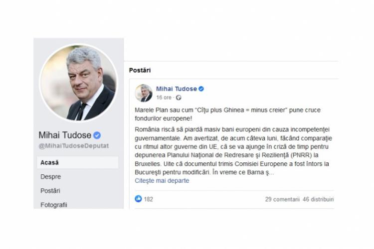 Europarlamentarul PSD Brăila, Mihai Tudose, s-a arătat îngrijorat în privința traseului Planului Național de Redresare și Reziliență (PNRR), după ce documentul a fost trimis înapoi la București de către Comisia Europeană pentru revizuire. Acesta a făcut recent un comentariu pe această temă, pe care l-a publicat pe rețelele de socializare cu titlul: ”Marele Plan sau cum «Cîţu plus Ghinea = minus creier» pune cruce fondurilor europene!”. Pe scurt, acesta a avertizat că România riscă să piardă foarte mulți bani europeni, doar pentru că ministrul Investițiilor și proiectelor europene, Cristian Ghinea, și vicepremierul Dan Barna nu și-ar fi făcut treaba corect și nu ar fi ținut cont de doleanțele Comisiei Europene la încropirea PNRR.