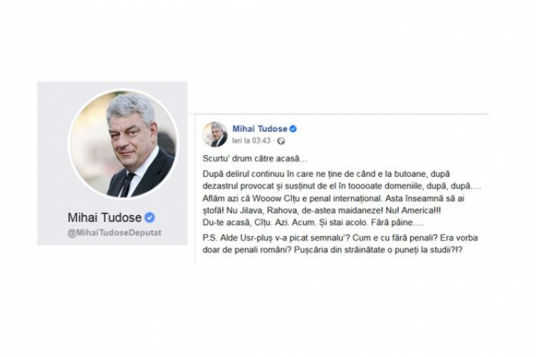 ”Scurtu’ drum către acasă… După delirul continuu în care ne ține de când e la butoane, după dezastrul provocat și susținut de el în tooooate domeniile, după, după…. Aflăm azi că Wooow Cîțu e penal internațional. Asta înseamnă să ai ștofă! Nu Jilava, Rahova, de-astea maidaneze! Nu! America!!! Du-te acasă, Cîțu. Azi. Acum. Și stai acolo. Fără pâine…”, a declarat Tudose.