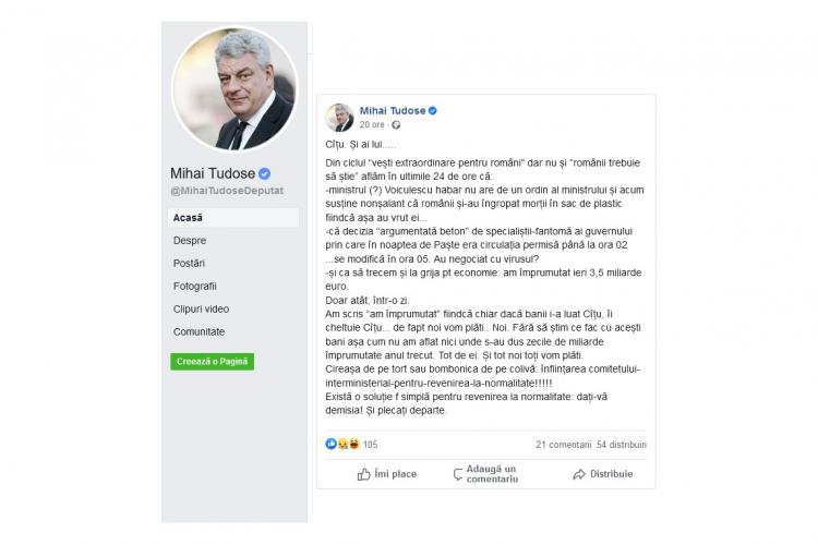 ”Din ciclul «vești extraordinare pentru români» dar nu și «românii trebuie să știe» aflăm în ultimile 24 de ore că: ministrul (?) Voiculescu habar nu are de un ordin al ministrului și acum susține nonșalant că românii și-au îngropat morții în sac de plastic fiindcă așa au vrut ei… Că decizia «argumentată beton» de specialiștii-fantomă ai guvernului prin care în noaptea de Paște era circulația permisă până la ora 02… se modifică în ora 05. Au negociat cu virusul? Și ca să trecem și la grija pentru economie: am împrumutat ieri 3,5 miliarde euro. Doar atât, într-o zi. Am scris «am împrumutat» fiindcă chiar dacă banii i-a luat Cîțu, îi cheltuie Cîțu… de fapt noi vom plăti… Noi. Fără să știm ce fac cu acești bani așa cum nu am aflat nici unde s-au dus zecile de miliarde împrumutate anul trecut. Tot de ei. Și tot noi toți vom plăti. Cireașa de pe tort sau bombonica de pe colivă: înființarea comitetului-interministerial-pentru-revenirea-la-normalitate!!!!! Există o soluție foarte simplă pentru revenirea la normalitate: dați-vă demisia! Și plecați departe”, a scris Tudose pe Facebook.