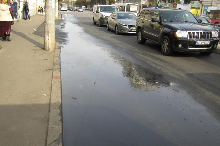 * luni, s-a mai făcut o tentativă de reasfaltare a carosabilului, astfel încât apa de ploaie să se scurgă corespunzător la canalizare * ieri, la proba cu apa, tot s-a format baltă în stație