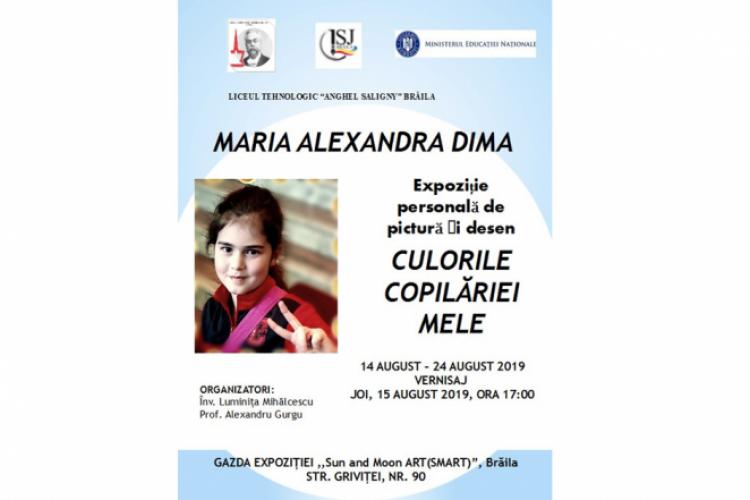 O fetiţă din Brăila va avea parte de cel mai frumos cadou de ziua onomastică: prima sa expoziţie de pictură. Maria-Alexandra Dima, elevă la Liceul Tehnologic “Anghel Saligny”, este o artistă în devenire, pasiunea sa fiind pictura. La ora 17.00, va avea loc expoziţia “Culorile copilăriei mele”, în cadrul căreia vor fi expuse tablourile realizate de micuţa artistă brăileancă. Evenimentul va avea loc în cadrul Atelierului de Pictură “Sun&Moon Art (SMART)”, situat pe strada Griviţei, nr. 90, în municipiu, şi este organizat de învăţătoarea Luminiţa Mihălcescu şi prof. Alexandru Gurgu.