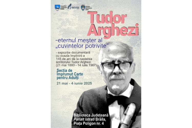 Cu prilejul împlinirii a 145 de ani de la nașterea scriitorului Tudor Arghezi, Biblioteca Județeană ”Panait Istrati” Brăila invită iubitorii de carte să descopere universul fascinant al unuia dintre cei mai importanți creatori ai literaturii române moderne, în cadrul expoziției documentare Tudor Arghezi – eternul meșter al cuvintelor potrivite. Vernisajul a avut loc miercuri, 21 mai, iar expoziția, care va fi deshisă publicului până în data de 4 iunie, aduce în prim-plan viața, opera și contribuția esențială a lui Tudor Arghezi la înnoirea limbajului poetic, printr-o selecție de cărți care aparțin secției Împrumut pentru Adulți din cadrul Bibliotecii Județene Panait Istrati Brăila. Expoziția este realizată de Silvia Iacob, bibliotecar.