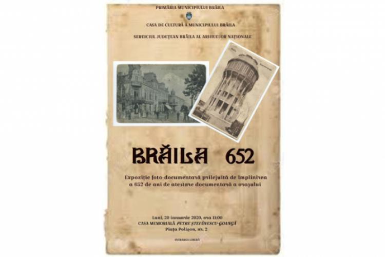 Casa de Cultură a municipiului Brăila, cu sprijinul Serviciului Judeţean Brăila al Arhivelor Naţionale, vernisează, luni, 20 ianuarie 2020, ora 12.00, la Casa Memorială “Petre Ştefănescu Goangă”, o expoziţie fotodocumentară realizată cu prilejul împlinirii a 652 de ani de atestare documentară a municipiului Brăila.