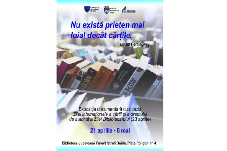 Cu ocazia Zilei Internaționale a cărții și a dreptului de autor și a Zilei Bibliotecarului (23 aprilie), în perioada 21 aprilie – 8 mai 2023, Biblioteca Județeană „Panait Istrati” Brăila organizează o expoziție documentară intitulată ”Nu există prieten mai loial decât cărțile”, titlu inspirat din celebrul citat al marelui scriitor Ernest Hemingway.