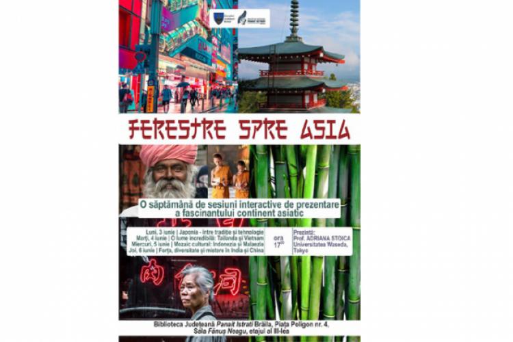 Începând de luni, 3 iunie, ora 17.00, Biblioteca Judeţeană “Panait Istrati” Brăila organizează evenimentul “Ferestre spre Asia”, însemnând o serie de sesiuni interactive de prezentare a fascinantului continent asiatic. Workshop-urile vor fi susţinute de Adriana Stoica, profesor la Universitatea Waseda, Tokyo.
