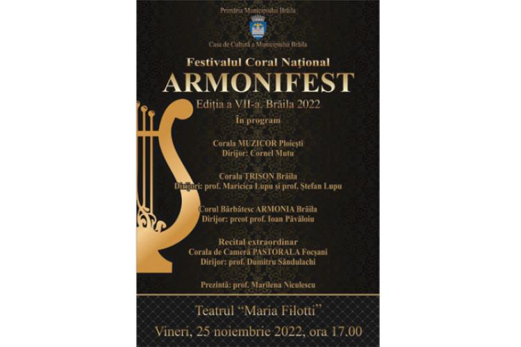 Potrivit comunicatului trimis de organizatori, în după-amiaza zilei de vineri, 25 noiembrie 2022, începând cu ora 17.00, la Teatrul „Maria Filotti” , se va desfășura cea de a VII-a ediție a Festivalului Coral Național „Armonifest”, manifestare organizată de Casa de Cultură a Municipiului, cu sprijinul Primăriei Municipiului Brăila.