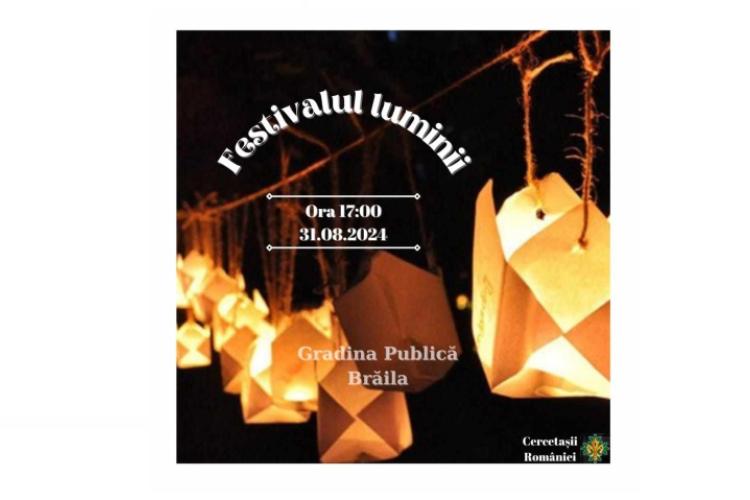 Sâmbătă, 31 august, în Grădina Publică a Brăilei, are loc Festivalul Luminii, eveniment organizat, începând cu ora 17.00 și până la ora 21.00, de Cercetașii României – Centrul Local „Nufărul Alb” Brăila, alături de 140 de cercetași din localitățile Galați, Tecuci, Matca, Constanța și Iași. În cadrul festivalului, vor fi organizate mai multe ateliere de creativitate și abilitate și va fi prezentat un program artistic cu muzică live, susținut de talentații elevi ai Școlii Populare de Arte „Vespasian Lungu” Brăila.