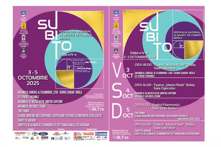 „SUBITO – neașteptatul, revelația, clipa de grație în care muzica devine miracol și lasă în noi o altă lumină. Acesta este spiritul pe care îl aduce la Brăila, între 3 și 5 octombrie 2025, cea de-a patra ediție a Festivalului Național al Muzicii de Cameră SUBITO, un eveniment organizat de Filarmonica „Lyra – George Cavadia”, cu sprijinul Consiliului Județean Brăila, al Primăriei Municipiului Brăila și al Uniunii Compozitorilor și Muzicologilor din România”, precizează prof. Alexandra Gurgu, secretar muzical al Filarmonicii „Lyra – George Cavadia” Brăila.