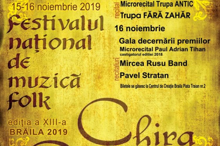 Cea de a XIII-a ediţie a Festivalul Naţional de Folk „Chira Chiralina” se va desfăşura în acest an în perioada 15-16 noiembrie, iar concurenţii, tineri cu vârste cuprinse între 14 şi 35 de ani, se pot înscrie până pe data de 8 noiembrie. Festivalul este organizat de Consiliul Judeţean Brăila, Centrul Judeţean pentru Conservarea şi Promovarea Culturii Tradiţionale, cu sprijinul Primăriei Municipiului Brăila şi al Teatrului „Maria Filotti” şi este un eveniment competitiv, care are drept scop descoperirea şi promovarea de noi talente interpretative şi de creaţie ale muzicii folk, cât şi de continuare a unei importante tradiţii a genului la Brăila. Anul acesta, organizatorii concursului vor oferi premii considerabile: