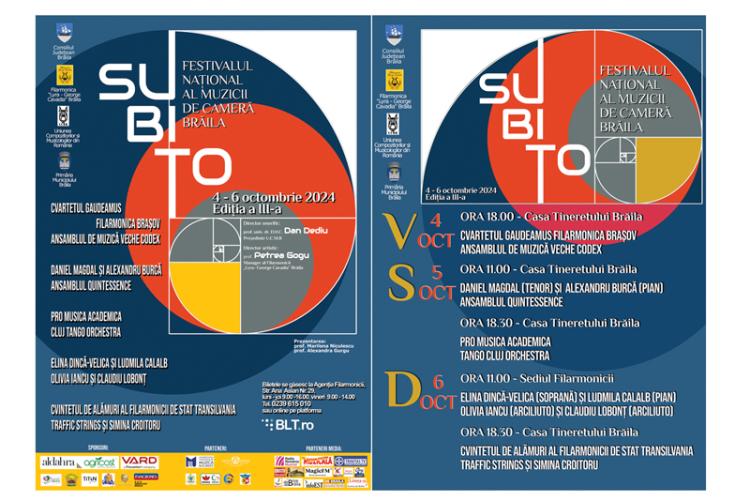 „În perioada 4-6 octombrie 2024, orașul Brăila va fi învăluit din nou de mantia sunetelor de o delicatețe rară, căci SUBITO – Festivalul Național al Muzicii de Cameră revine, preschimbat în cea de a treia ediție, chemând laolaltă pasionați, maeștri și tineri virtuozi ai acestei arte sculptate în timp și suflet. SUBITO nu este doar un festival, ci o celebrare grandioasă a muzicii de cameră, unde fiecare privire schimbată între interpreți și public devine o poveste despre sensibilitate, frumusețe și comuniune artistică”, a precizat prof. Alexandra Gurgu, secretar muzical al Filarmonicii „Lyra – George Cavadia” Brăila.