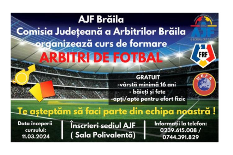 Comisia Județeană de Arbitri Brăila din cadrul A.J.F. Brăila se alătură proiectului Federației Române de Fotbal, Comisiei Centrale a Arbitrilor, de dezvoltare a arbitrajului și pe 11 martie demarează un nou curs de formare a arbitrilor de fotbal.