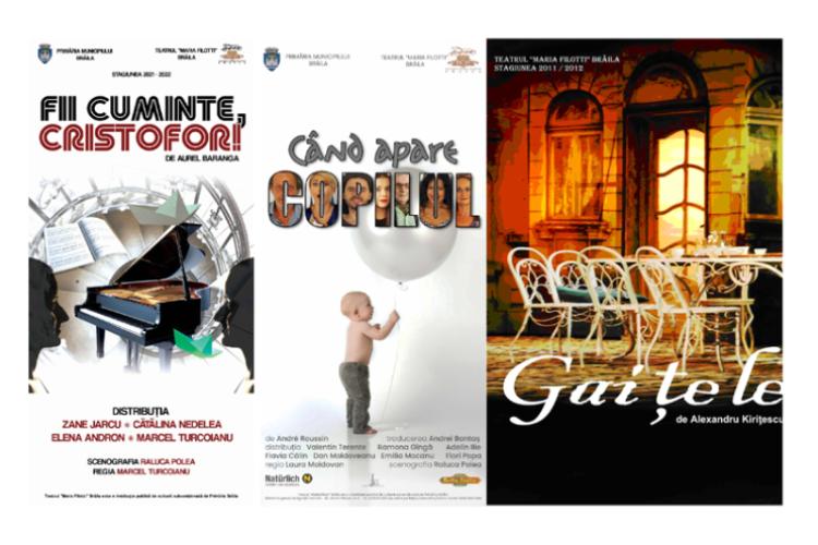 Sâmbătă, 30 noiembrie, Sala Mare, ora 18.00, ”Când apare copilul”. Traducerea: Andrei Bantaș, regia Laura Moldovan, scenografia Raluca Polea, Distribuția: Charles Jacquet: Valentin Terente, Olympe Jacquet: Ramona Gîngă, Domnul Jacguet: Gigi Antonescu, Madeleine Lonant: Flori Popa, Therese: Emilia Mocanu, Annie Jacquet:Blanca Doba, Georges Jacquet: Adelin Ilie. „Venirea pe lume a unui copil este o responsabilitate care în familia Jacques generează o serie de conflicte, întrebări, încurcături comice, efervescente și intense. Când dulce, când amar, dinamic și optimist, textul lui Andre Roussin trece testul timpului prin abordarea unor subiecte extrem de actuale. Legea privind sancționarea avorturilor, oportunitatea politică, familia, iubirea, educația, toate se regăsesc într-o explozie de situații comice și neprevazute.”Duminică, 1 Decembrie, Sala Mare, ora 18.00, ”Gaițele” de Alexandru Kirițescu. Regia: Radu Nichifor. Decoruri și costume: Vioara Bara. Distribuția: Monica Zugravu-Ivaşcu, Elena Andron,