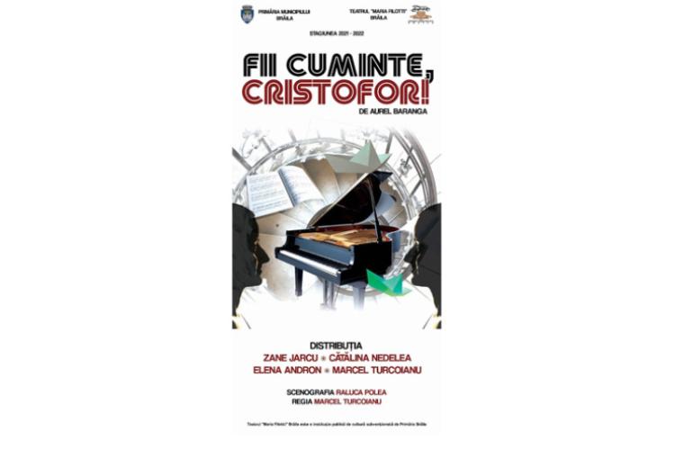 Evenimentele teatrale extraordinare continuă și în această săptămână, iar Teatrul “Maria Filotti” anunță o nouă premieră: “Fii cuminte, Cristofor!”. Piesa lui Aurel Baranga este regizată de Marcel Turcoianu, actor de peste 25 ani al teatrului brăilean. Avanpremiera și premiera spectacolului au loc vineri și sâmbătă, pe 6 și 7 mai, de la ora 18.00, la Sala Studio, iar în spectacol joacă actorii Zane Jarcu, Cătălina Nedelea, Elena Andron și Marcel Turcoianu. Scenografia spectacolului este realizată de Raluca Polea.
