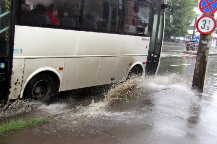 • mașinile care trec în viteză prin bălțile de pe carosabil le fac viața grea pietonilor din stația de autobuz de pe Calea Călărașilor • în piață, de pe o copertină curge un șuvoi de apă peste clienți și comercianți