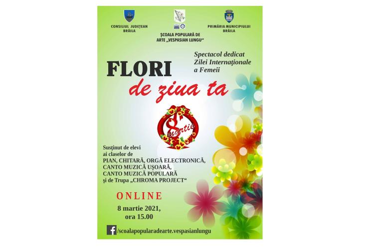 Luni, 8 martie, începând cu ora 15.00, Şcoala Populară de Arte „Vespasian Lungu“ Brăila va prezenta, pe pagina sa de Facebook, spectacolul muzical online „Flori de ziua ta”, dedicat zilei internaţionale a femeii.