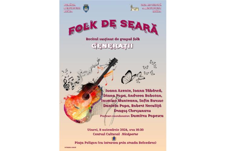 Casa de Cultură a Municipiului Brăila îi invită pe brăileni vineri, 8 noiembrie, de la ora 16:30, la un recital de muzică folk oferit de membrii grupului „Generaţii”. Spectacolul, intitulat „Folk de seară”, va avea loc la Centrul Cultural Nicăpetre, din Piaţa Poligon.