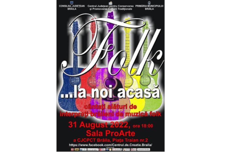 Consiliul Județean Brăila, prin Centrul Județean pentru Conservarea și Promovarea Culturii Tradiționale Brăila, și Primăria Municipiului Brăila invită iubitorii de muzică folk, în data de 31 august 2022, începând cu ora 18:00, la evenimentul cultural-artistic ”Folk… la noi acasă”, o continuare a proiectului cultural de anvergură ”Seară de folk”, proiect născut din dorința de a contribui la redescoperirea și menținerea fenomenului muzicii folk, a folk-ului veșnic tânăr, în rândul iubitorilor acestui gen muzical și nu numai.