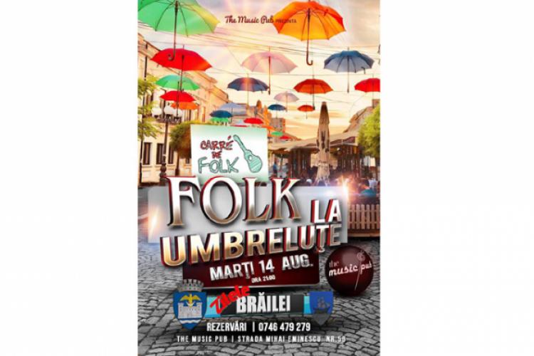 De când nu aţi mai fost la un concert în Centrul Vechi al Brăilei? Întrebarea aceasta vă este adresată de organizatorii evenimentului “Folk la umbreluţe”, care, de Zilele Brăilei, s-au gândit să reînvie atmosfera de pe Regală chiar şi pentru câteva ore. Aşa cum sugerează şi titlul, este vorba despre un concert de muzică folk susţinut de trupa brăileană “Carre de folk”, formată din Leonard Puia, Florin Lazăr, Marian Ionescu şi Claudiu Ene. Spectacol va avea loc astăzi, începând cu ora 21.00, la “The Music Pub” iar intrarea este liberă.