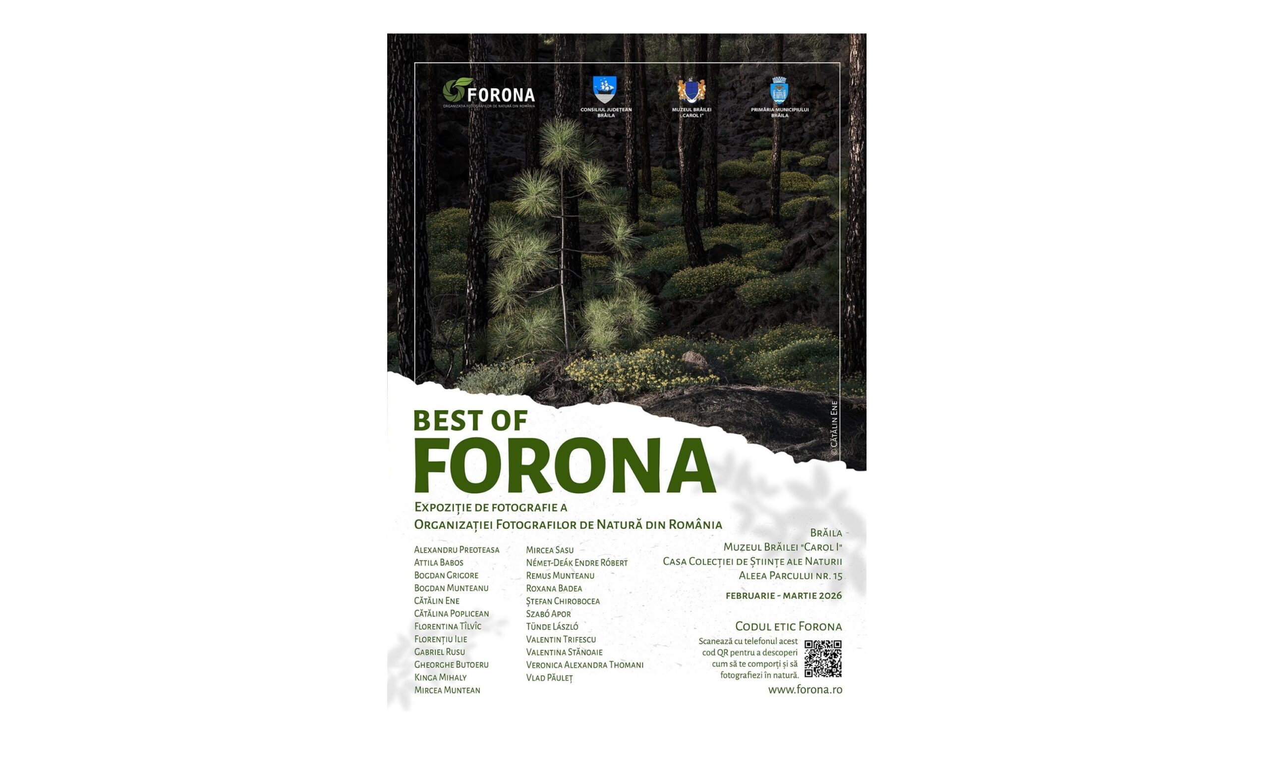 O expoziție cu totul și cu totul specială a fost deschisă, zilele trecute, la Muzeul Brăilei „Carol I” – Secția de Științe ale Naturii. Este vorba de Expoziția de fotografie „Best of FORONA” a Asociației FORONA – Asociația Fotografilor de Natură din România. Aceasta va fi deschisă publicului la Casa Colecției de Științe ale Naturii din Parcul Monument (Aleea Parcului nr. 15) în perioada februarie – martie 2026. Expoziția cuprinde imaginile câștigătoare ale etapelor lunare la edițiile desfășurate de către FORONA în anii 2022 – 2024.