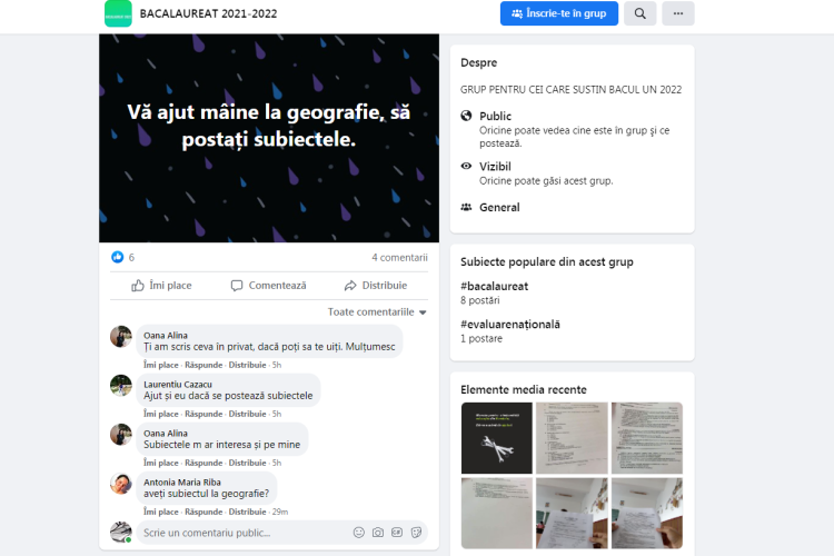 Fraudă la sesiunea de toamnă a Bacalaureatului! Chiar și cu sălile supravegheate audio-video, cu bagajele şi telefoanele depozitate într-o altă cameră înainte de intrarea în sală, absolvenţii care susţin examenul tot reuşesc să „fenteze” procedură şi să aibă asupra lor tot felul de gadget-uri care să îi ajute să comunice cu cei din exteriror. S-a întâmplat acest lucru chiar astăzi, mai mulţi candidaţi din cinci judeţe ale ţării reuşind să copieze prin intermediul Facebook-ului. Practic, pe reţeaua de socializare a fost creat un grup – „Bcalaureat 2021-2022”, unde candidaţi aflaţi în sala de examen postau subiectele primite, iar ceilalţi membri se ofereau să le trimită rezolvările.