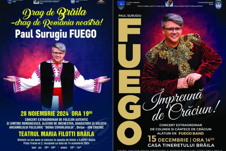 Cunoscutul interpret Paul Surugiu – Fuego va susține, în perioada următoare, două concerte la Brăila, unul către finele lunii noiembrie, iar celălalt la jumătatea lunii decembrie 2024. Pentru ambele concerte, biletele pot fi achiziționate de la Agenția de bilete a Centrului Județean pentru Conservarea și Promovarea Culturii Tradiționale Brăila (Centrul de Creație), din Piața Traian nr. 2.