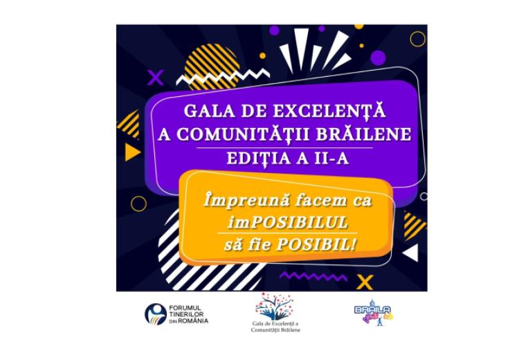 * ieri, 7 decembrie, Forumul Tinerilor din România – Brăila a anunțat finaliștii Galei de Excelență a Comunității Brăilene, ediția a II-a, pentru fiecare din cele 13 categorii * câștigătorii vor fi anunțați vineri, 9 decembrie, în cadrul unui eveniment ce va avea loc la Regal Events Ballroom Brăila * până atunci, astăzi și mâine (până în ora 14.00), pe pagina de Facebook a Galei, puteți vota proiectul preferat, în cadrul secțiunii ”Premiul de popularitate”