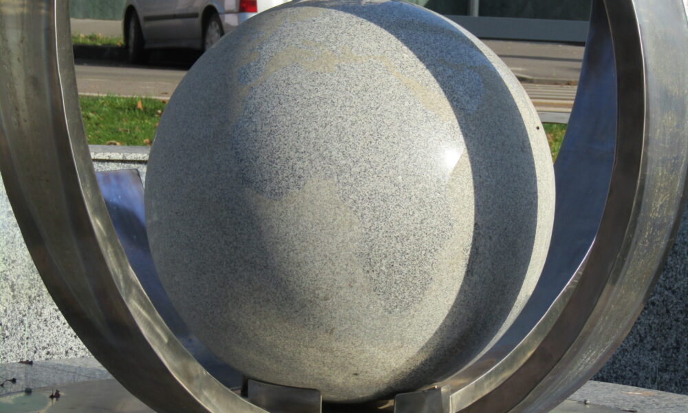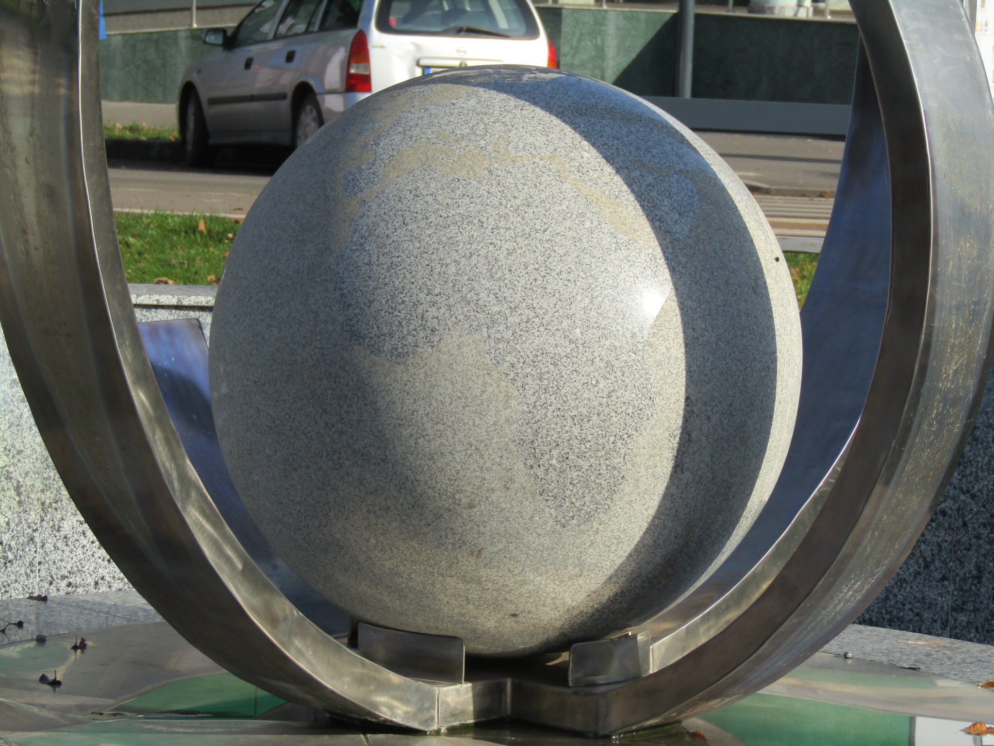 De fapt, este un glob pământesc având imprimate pe el continentele lumii, realizate, se pare, prin tehnologia “grafit laser”. Aşa o fi, însă din păcate cu un contrast prea slab pentru a fi uşor lizibile pentru trecători. Probabil că mult mai vizibil ar fi fost un planiglob autocolant aplicat pe sfera fântânii, dacă poate fi aprobat aşa ceva de către responsabilii din administrația locală…