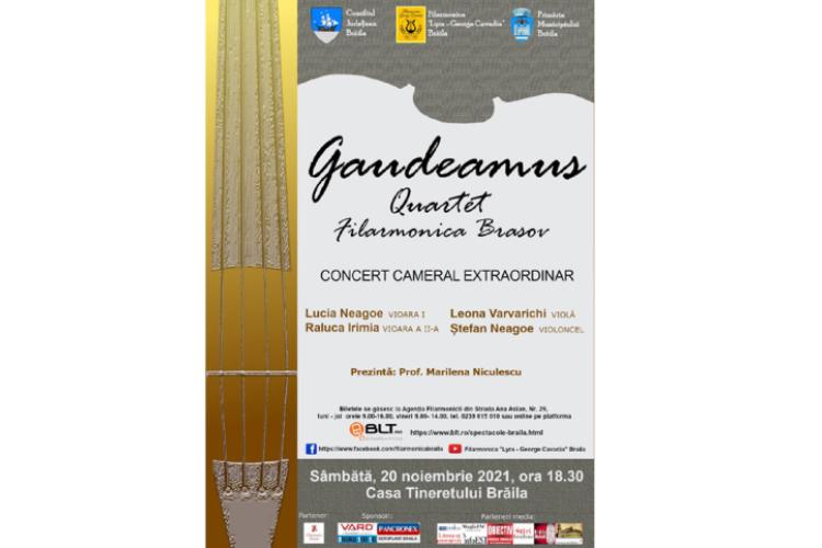 Cu o bogată experiență și o dedicare de 35 de ani în slujba Muzicii, Gaudeamus – Filarmonica Brașov poposește pe tărâmuri brăilene pentru a ne propune o cufundare în lumea artei sonore. Pe 20 noiembrie 2021, ora 18.30, Filarmonica „Lyra – George Cavadia” Brăila vă invită la un Concert cameral extraordinar la Casa Tineretului Brăila, în care veți avea onoarea de a îi cunoaște și de a-i asculta pe cei patru mesageri ai frumosului. Componența formației camerale s-a schimbat de-a lungul timpului ajungând în prezent la formula: Lucia Neagoe – vioara I, Raluca Irimia – vioara a II-a, Leona Varvarichi – violă și Ștefan Neagoe – violoncel.